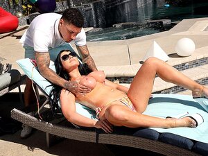 Un mec se frotte d'huile sur des gros nichons de MILFs en plein air