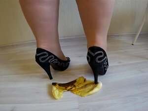 Cette nana porte des collants en nylon, des talons hauts et écrase une banane avec ses talons hauts
