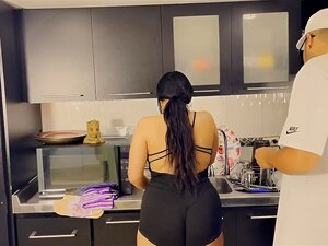 Aider ma belle-mère avec un arrière massif tout en nettoyant la cuisine
