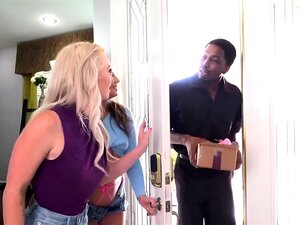 Enfin, le colis de la mignonne Athena Faris arrive et elle a hâte de l'utiliser et le gars a également apprécié le livreur de mignonnes chaudes est venu et elle l'a aidé La petite mignonne a apprécié lécher la chatte et s'est agenouillée pour lui sucer la