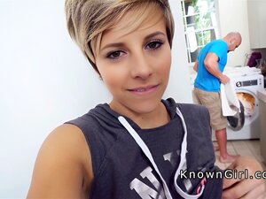 Petite amie infidèle baise dans la buanderie, petite amie infidèle veut la bite d'un mec musclé dans la buanderie de sa maison puis en culotte bleue baise sa grosse bite en POV et découvre ses tétons percés