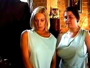 Brune classique suce une bite poilue. La brune vintage suce une bite poile pendant que son amie blonde regarde