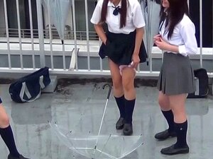 Petites asiatiques assises sur le banc et montrant leurs culottes sous les jupes, les mignonnes japonaises ont l'air si fraîches et innocentes assises sur le banc du parc. Le cameraman coquin est assis en face et voyeurise ces flashs de culotte délicieux